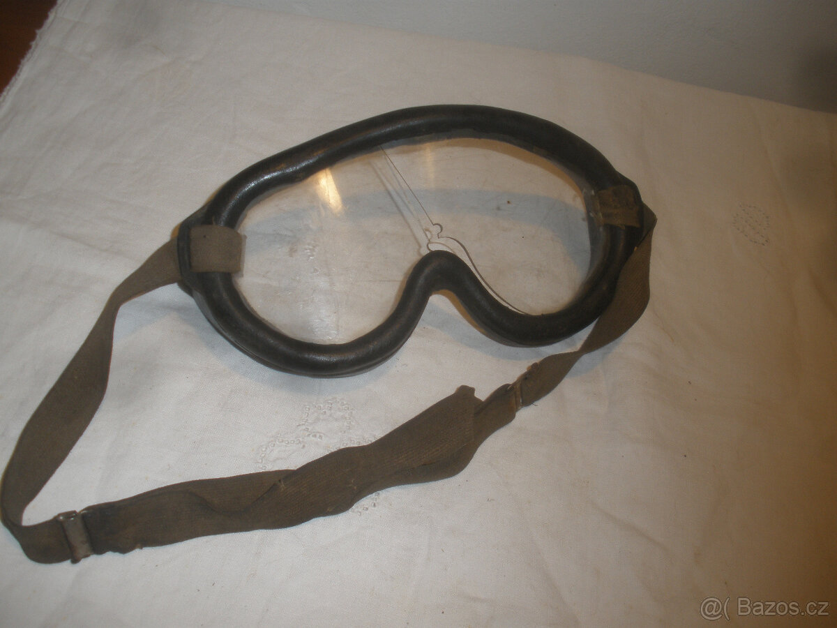Gumové brýle na motorku,prasklé sklo/plexisklo/,stav viz foto, plexisklo půjde vyměnit,značka nenalezena,poválečná americká výroba.Osobní předání Mělnicko nebo posílám poštou