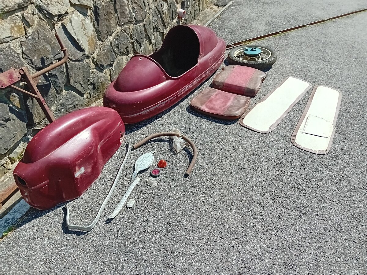 Prodám sajdu,vše co je na fotkách.Nové vnitřní čalounění, nepoškozené hliníkové lemy logo,původní sedačky.
