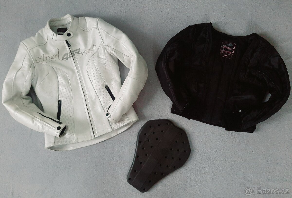 Prodám dnes již nesehnatelnou, velice kvalitní a svým designem překrásnou a ojedinělou, dámskou, koženou bundu Angel Wings White Pearl ve vel.36. Luxusní bílá perleť, která je na slunci ojedinělá! Celkový stav odpovídá novému zboží. Bunda použita pouze jako spolujezdec pár krátkých jízd a poté celou dobu uskladněna. Součástí bundy je vyjmutelná termovložka + dokupován páteřový chránič 990kč, původní cena bundy 7990kč. K bundě je možné zakoupit též rukavice ve vel.S stejného výrobce a stylu viz. můj další inzerát. Nejlépe osobní předání, kde si může kupující před koupí vše prohlédnout a vyzkoušet. Po dohodě lze zabalit a poslat. Dámská bunda poslední generace. Při jejím vývoji se hledělo především na pohodlí při každodenní použití na motocyklu. Vylepšený dámský střih, jemná kůže, částečná perforace, stahování pasu a kvalitní chrániče. Nechybí ani termovložka a dva druhy spojovacích zipů. Celek dotváří laserem vypalované nápisy a motiv andělských křídel na zádech. Pro každého anděla s ďáblem v těle! - 1,1 mm silná, jemná hovězí kůže