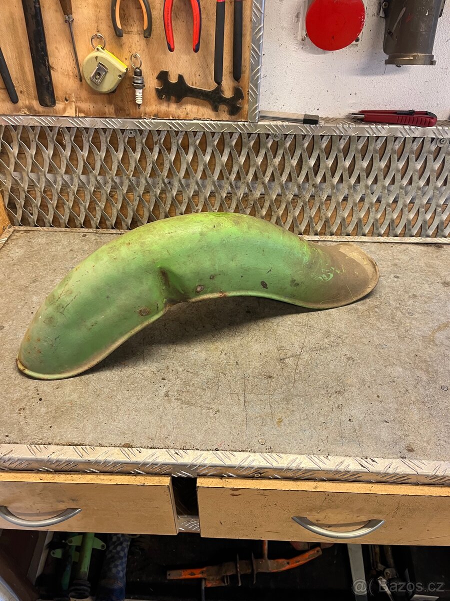 Přední blatník Jawa 555 - [27.11. 2025]Použitý přední blatník Jawa 555. Původní barva, místy jsou vidět linky. Blatník je zlomený, má dvě praskliny. Dvě malé promáčkliny. Stav dle foto. Úklid dílny.