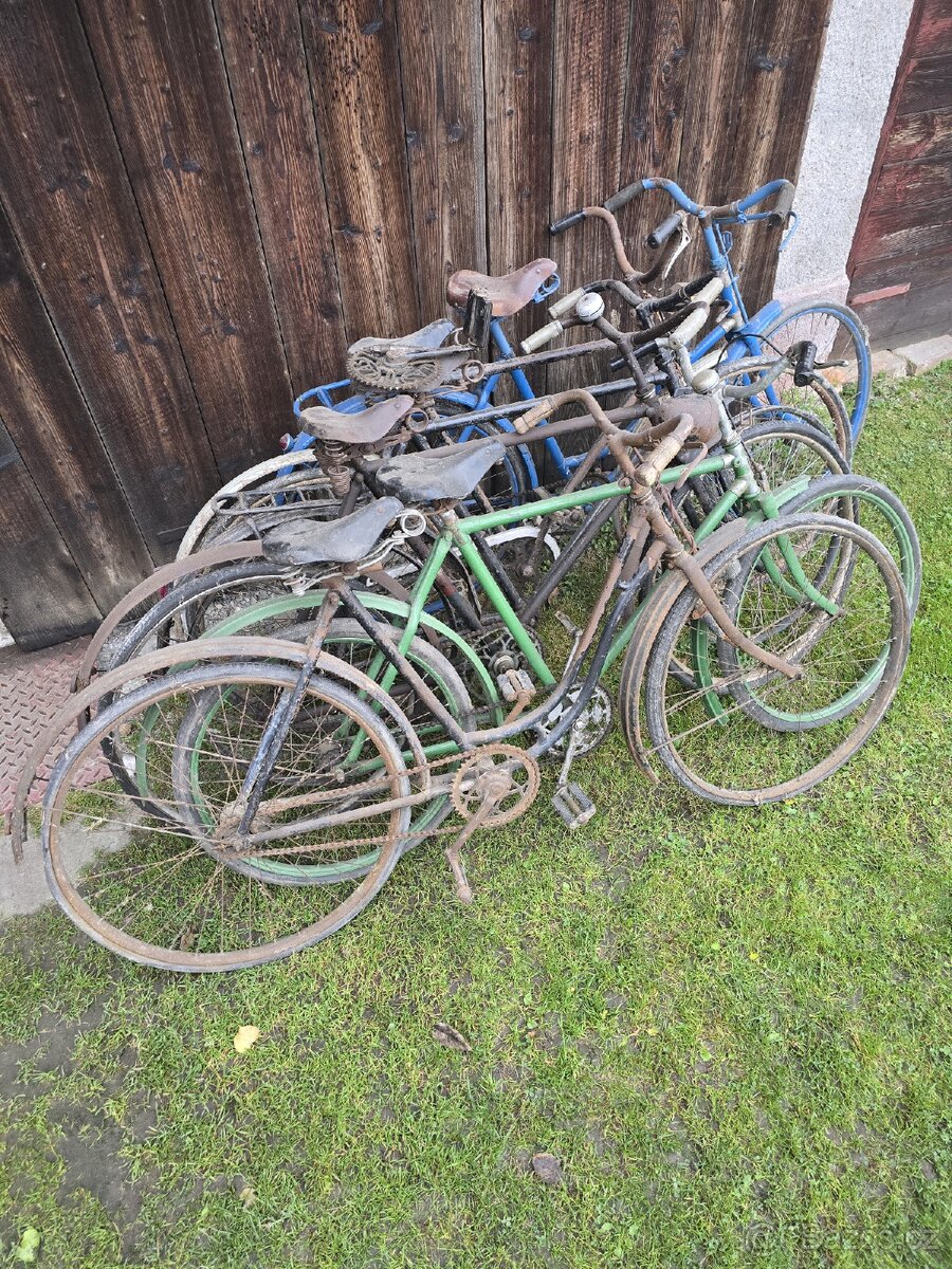 Stará kola na veterány - [13.12. 2025]Nalezeno na půdě, několik asi 5ks kol. Nálezový stav, nezasažení kutilem. Na dvou kolech pneu se vzorkem, jedno kolo drží tlak. Cena za kus.