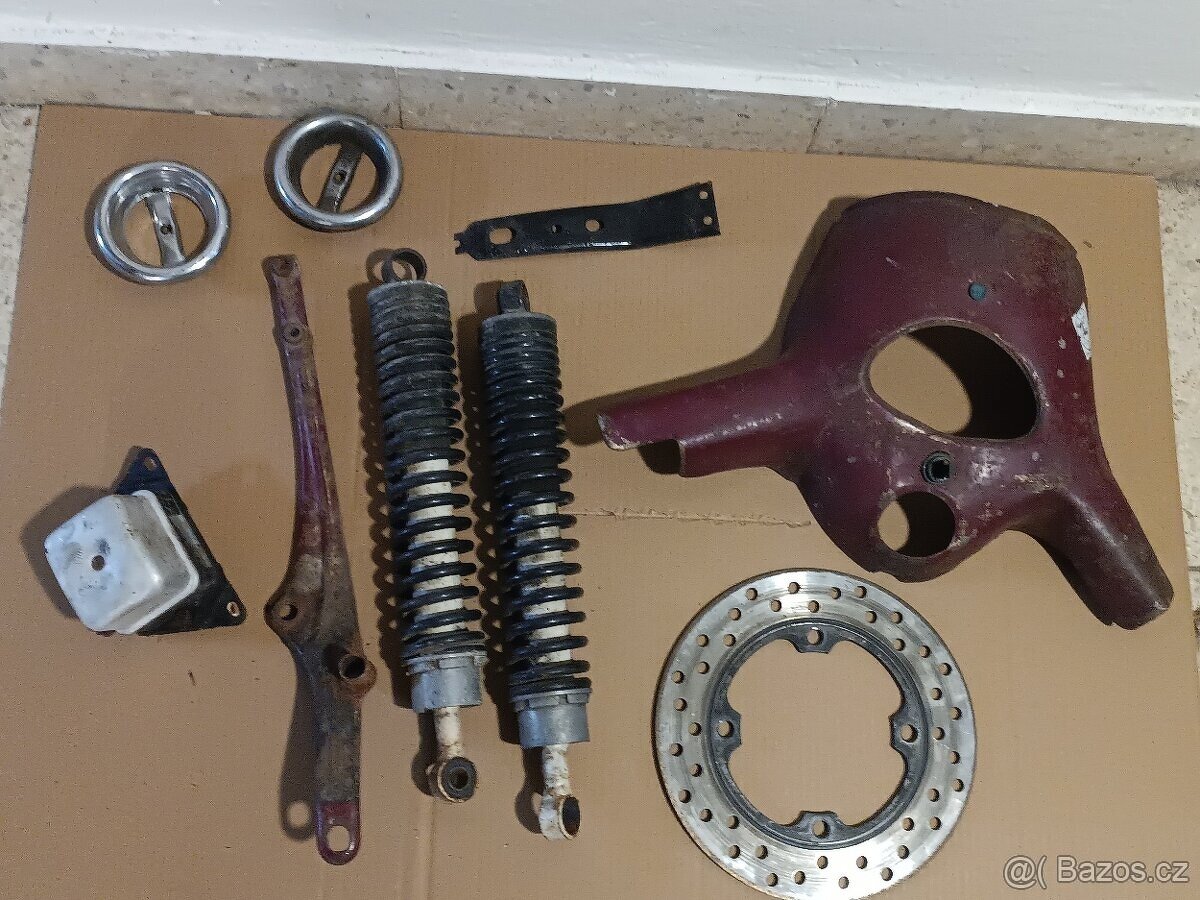 cena za vše na foto, je tam např. horní maska Jawa panelka ( ta je na opravu ), zadní tlumiče Jawa 350, chrom koncovky výfuků, kotouč 639, atd.