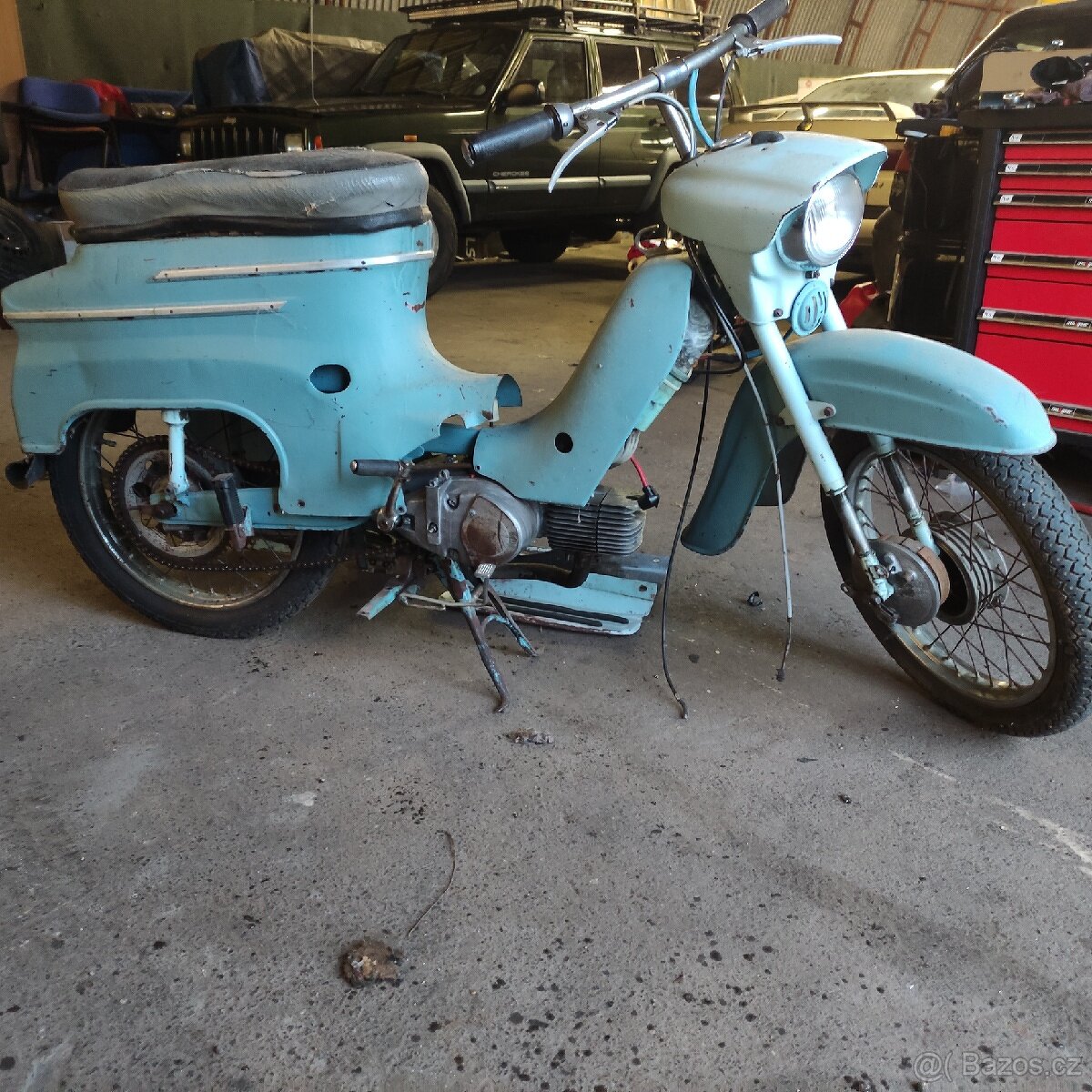 Nalezovy pekny stav , Jawa pionýr 20 , jeste stare plechove provedení zadni vidlice, motor lze protočit, nepojízdný, bez tp