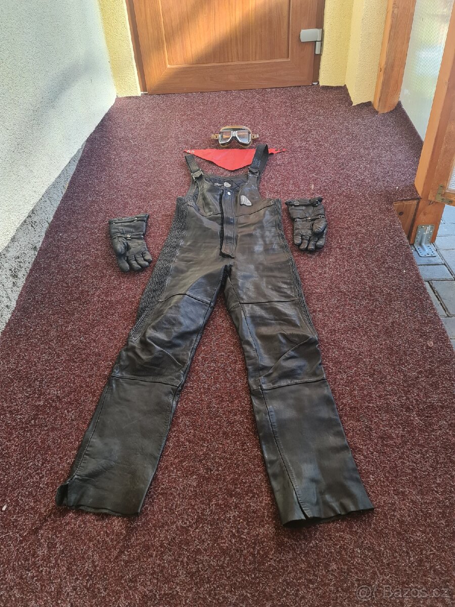 Motorkarske kožené kalhoty,nepromokavé kalhoty,starožitné kožené brýle,kožené rukavice,šátek,podle velikosti na ženskou S-M