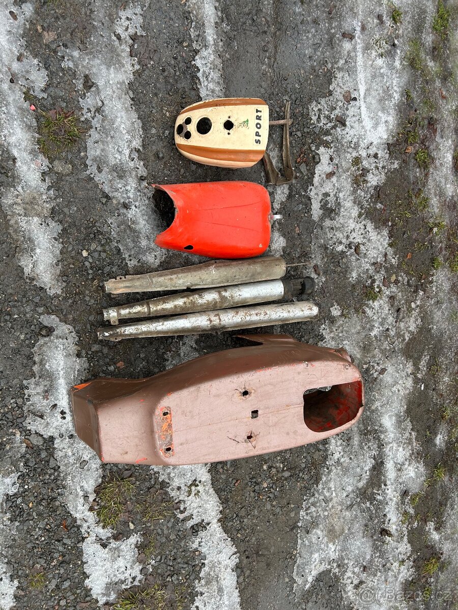Kostra Jawa pionýr - [6.2. 2026]Prodám kapličku, zadní plech a rám na Jawa pionýr, přední vidlice jsou verze bez manžet. Vše k opravě.