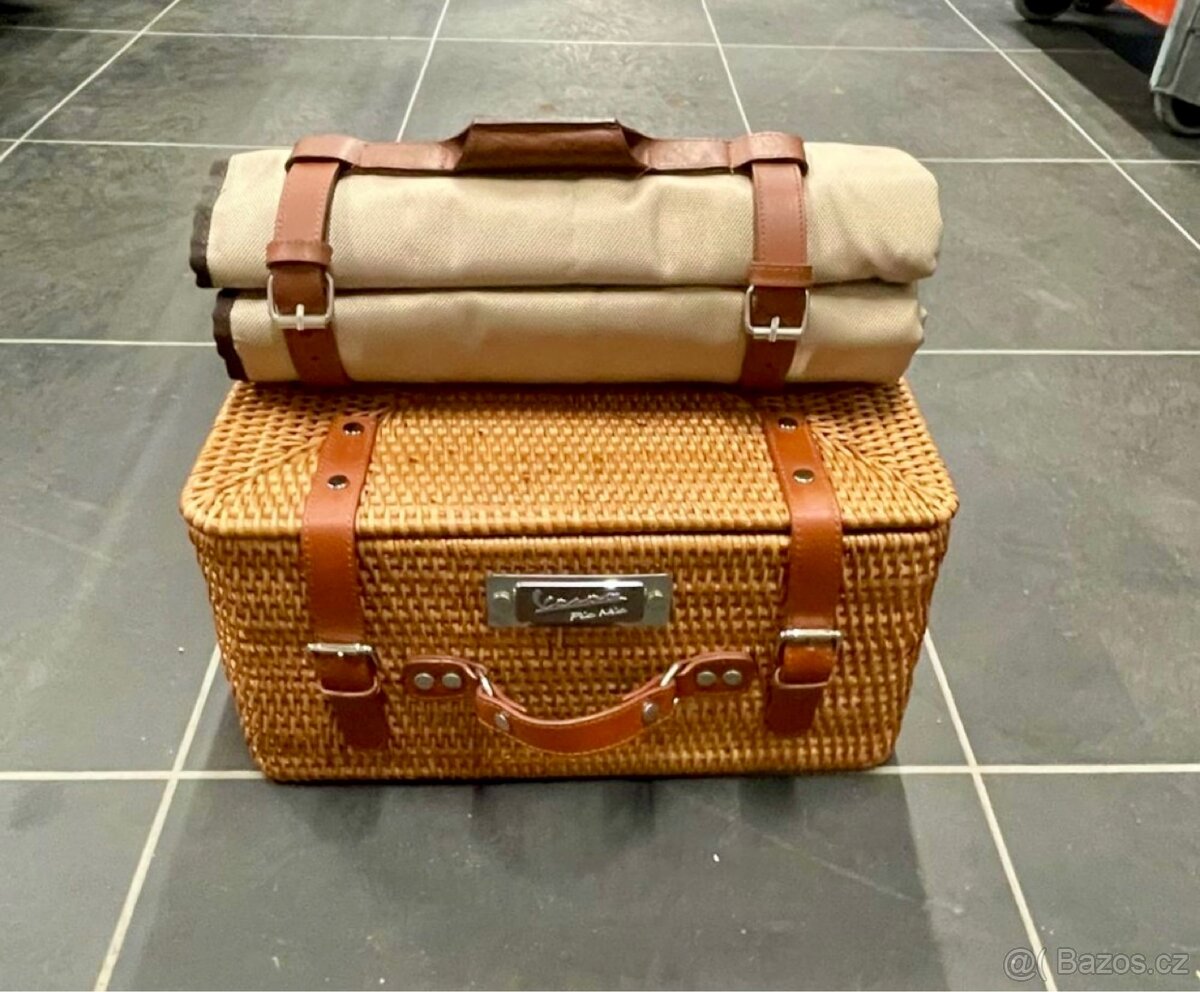 Prodám kompletní piknik set Vespa , obsahuje koš na nosič , piknik deku , ,pláštěnku vše originál zabalenou v krabicích nevybaleno