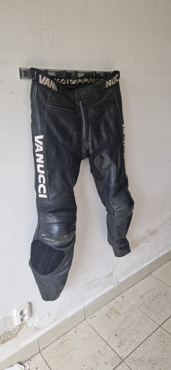 Italské kalhoty zn. Vanucci na moto ze silné hovězí kůže 2mm, CE protektory na kolenou, bocích, vzadu zip na spojení s bundou. Vel. 52. Velmi zachovalé.