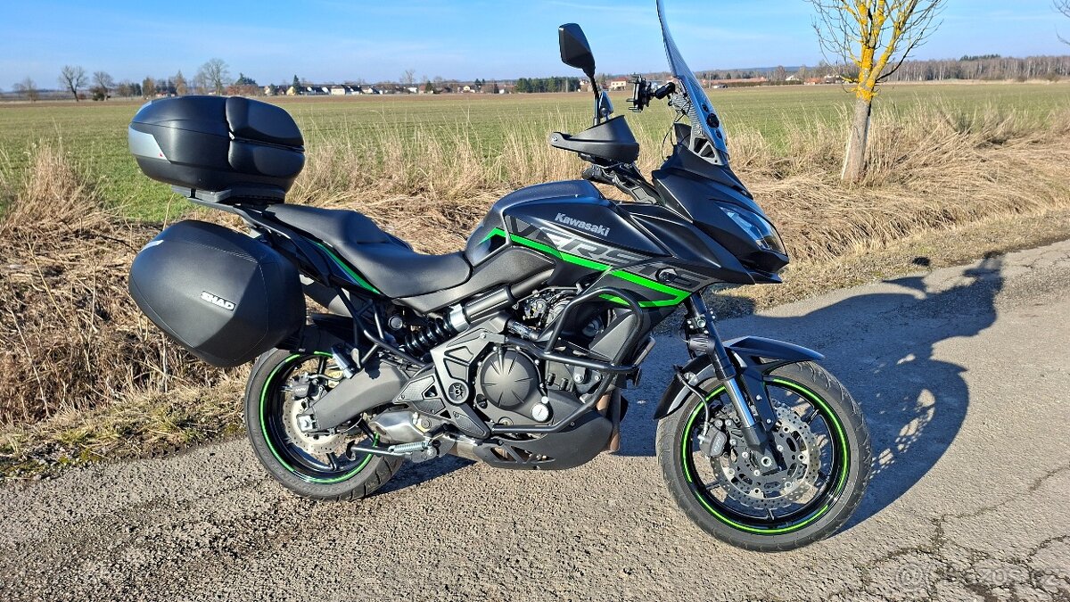 Prodám Kawasaki Versys 650 r.v. 2019 s ABS.aktuálně najeto 37800km. Cestovní plexy,3 kufry schad,kryty rukou,pneu zadní 2025.12V zásuvka+ USB Krásný stav. Info na tel.