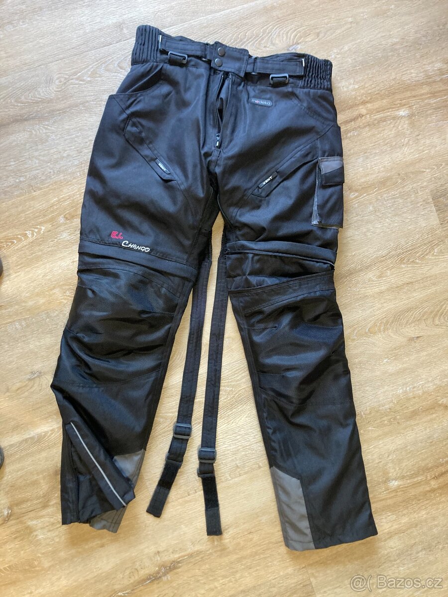 Prodám motokalhoty Modeka, vel. 164. Odnímatelná vložka, nastavitelná délka nohavic, větrání vpředu i vzadu, odepínatelné kšandy. Délka nohavic od pasu 96+7 cm, délka nohavic od rozkroku 77+7 cm, pas 40 cm. Cena nových 1.979,- Kč.