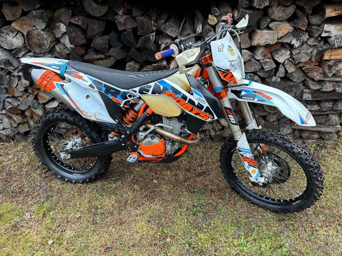 Prodám KTM EXC 350F Sixdays Argentina, r.v. 2015, 170MTH. Motocykl celkově v dobrém stavu, jetý rekreačně, pravidelně servisovaný, nyní bez investic. Kryty kyvné vidlice, předních vidlic, brzdového kotouče, víka zapalování + spojky, koncovky výfuku, kurty na tahání. Pneu téměř nové včetně zesílených duší a haltrů. Náhradní vzd. filtr,olejový filtr, brzdové destičky, páčky, originální příbal, uživatelská příručka. Důvod prodeje - 690 Enduro R. Více info na telefonu..