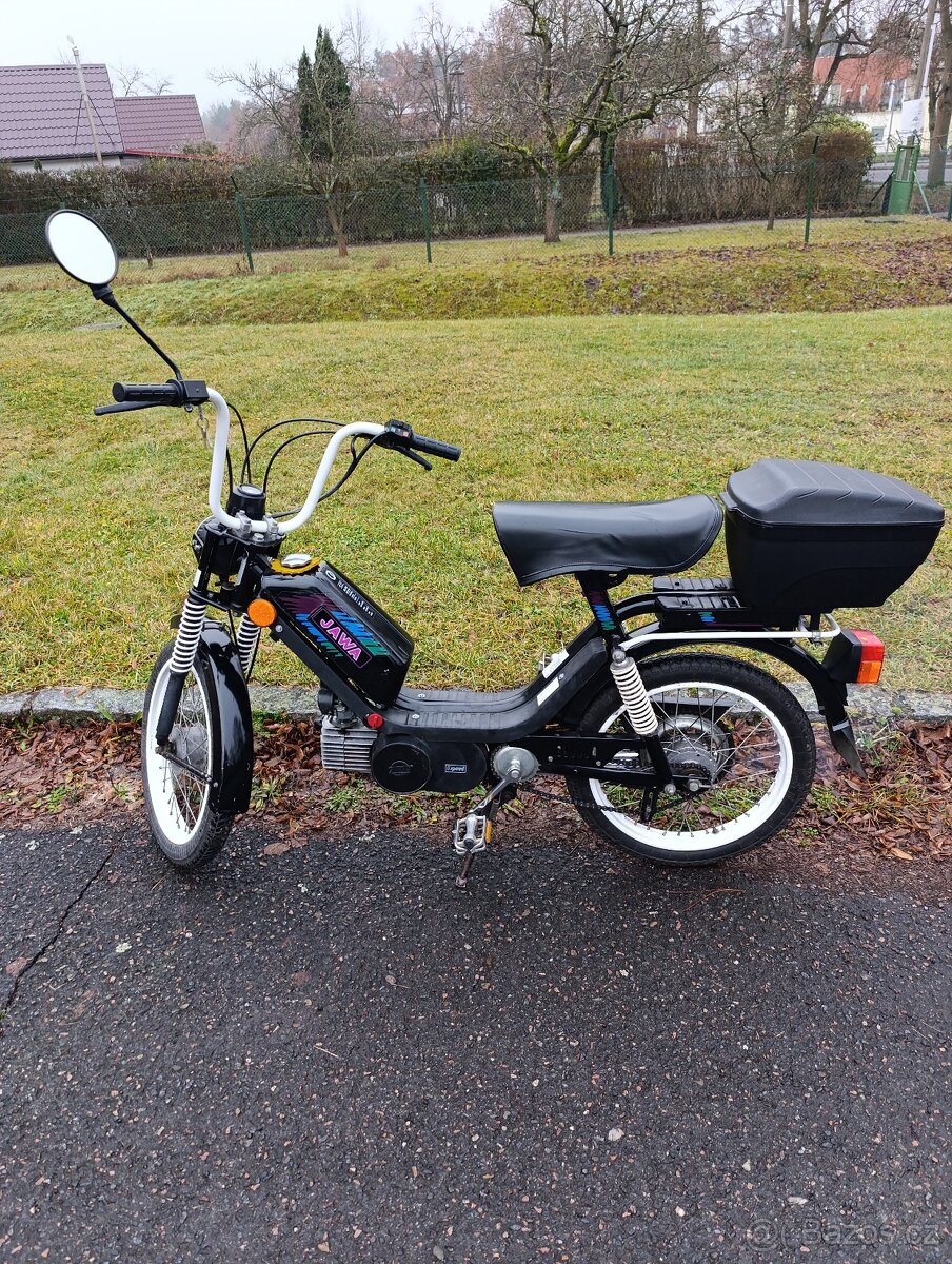 Babetta 210 Grand Lux - [12.2. 2026]Jawa Babetta 210 Grand Lux rok 1993 s kartičkou. Pěkný zachovalý stav.. Málo najeto 37xxkm. Vývozní verze. Původní černý lak. Babetta je plně pojízdná a vše funguje. Nádrž uvnitř pěkná. Stačí si zaplatit povinné ručení a jezdíte.