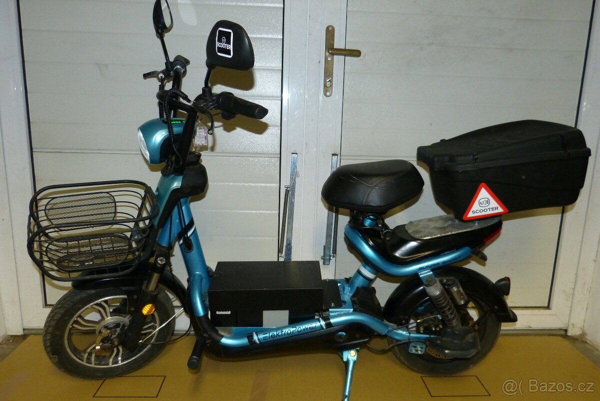 Dobrý den, prodám tento funkční scooter s úpravami. Výkon změněn na 2000 W ( naměřeno ) Jede hezky. Místo druhé mini sedačky je kufr. Doplněny stupačky a zrcátka. Zadní brzda je kotoučová. Baterie je olověná 4x12v - 18Ah ( naměřená kapacita 14 Ah ) Dojezd se mnou 95 kg v kopcích neúspornou jízdou je cca 10 km, je to také dáno větší spotřebou. Tlumiče jsou KO, zadní brzda občas hlučí při brždění, ale na funkci to nemá vliv. Přední kolo zoxidované. Více info se pokusím zodpovědět, k regulátoru přidám popisek pro případnou opravu. Lepší foto také mohu poslat. Nabíječku má. K vyzkoušení u Zruče nad Sázavou. Prodávám z důvodu nevyužití a bez mého budoucího servisování, pokud si koupíte, musíte si s tím poradit. Elektroscooter, elektromobil, elektro, aku.