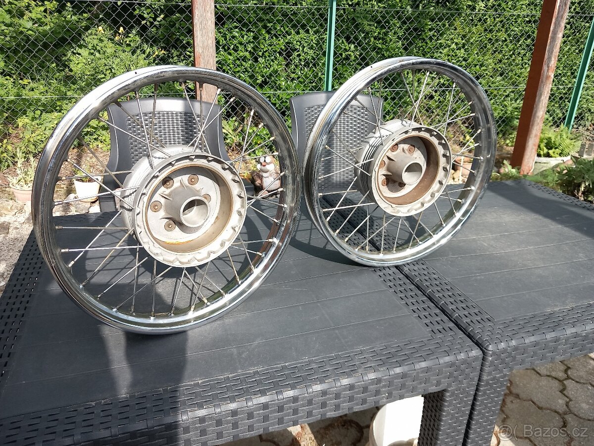 Vymením tieto dve nové nikdy nepoužité predné kola na prvé malé kývačky do roku 1958. Sú to uloženky zo starých zásob ČSSR nie repliky. Ešte v nich neboli osadené ani ložiská. Obidve kola sú rovnaké s unášačom rozety a šírkou ráfiku 58 mm (1,60). Kolesá sú nečistené, ešte zakonzervované od výroby. Vymením za takisto uloženkové nepoužité kolesá ale na mladšie Čz 175/450 a to predné s rovnakou šírkou ráfika 58 mm ale bez unášača rozety a zadné s unášačom a šírkou ráfika 68 mm. (1,85) takisto zachovalé s nepoškodeným pekným chrómom ako na mojich. Ak máte na výmenu tak môžme vymeniť alebo môžte odpredať pokiaľ nemáte záujem o moje. Kľudne aj po kuse ak nemáte obidve. Zrenovované replikové mi neponúkajte. Ďakujem. Kontaktujte ma na mail, alebo tel:+421902292125 ( kolo kola ráfek ráfky )