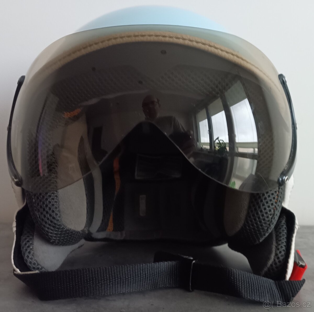 Přilba má řemínek na zapnutí.Ochranný štít se dá sundat.