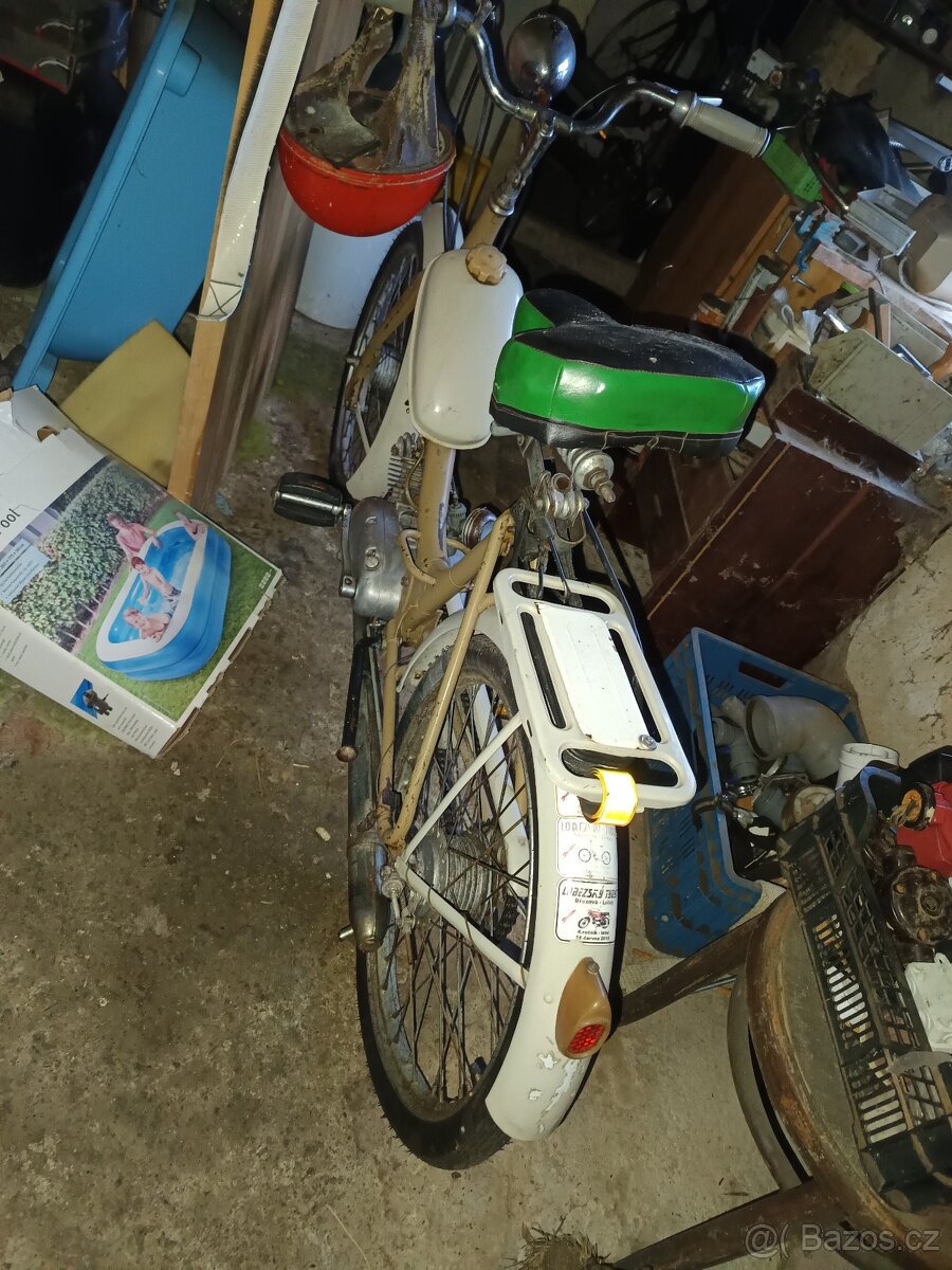 moped je po starší částečné repasi výbrus motoru včetně nových ložisek a nových ložisek v kolech blatníky nosič nádrž v práškovém laku rám ušák původní hnědý nízká řídítka víceméně jsem se snažil zachovat původní barvu ráz a patinu chytá na brnk uložen suchém sklepě přidám původní vidlici smrti která byla osazena na rámu