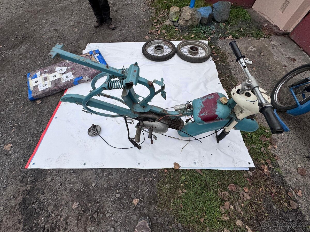 Prodám vše,jako kompletní soubor dilu. Neprodej je vše, co je na foto. Motor je odmontovam z rámu, ale je také na prodej .je to v podstatě skoro kompletní 555ka