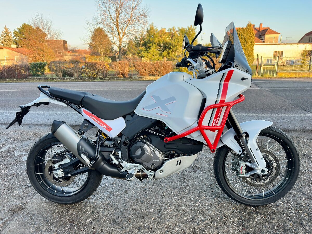 Ducati desert X, 2023, najeto cca 6 tis km, stav nového motocyklu, nepoložený motocykl, bez rzi a oxidace, bez kosmetických vad, zánovní stav, 2x klíč, 1. Majitel, dovoz It, padací rám,