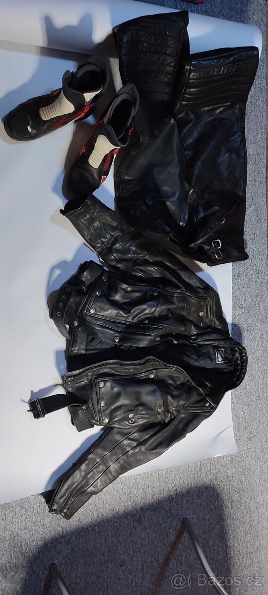 Prodám motorkářské kožené oblečení včetně bot.Velikost kalhot 48, boty 37.