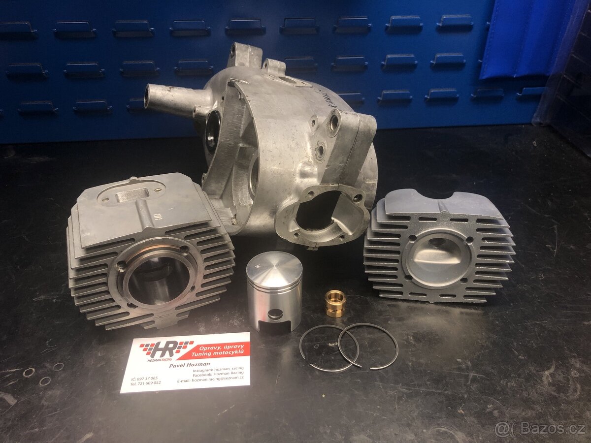 - Původní válec (žádný polák v kombinaci se slabou vložkou a malými přepouštěcími kanály) s novou a silnou vložkou, vše upravováno na CNC, se změnou časování a úhlování všech kanálů s ohledem na sériové komponenty (i výfuk).
