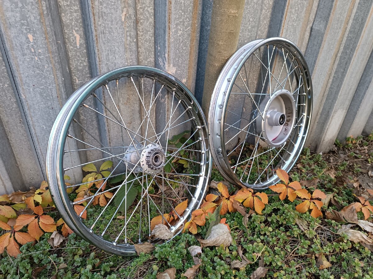 Kola Jawa 20-23 - [10.2. 2026]Prodám kompletní pár kol na Jawa 20-23 . Původní střed,štít,čelisti. Chemicky vyčištěno,vytočena brzdná plocha, nová ložiska,přelepene čelisti- skružené,nerezový výplet,chromovaný ráfek,vycentrovano. Připraveno k nasazení. Cena platná při dodání stře ...