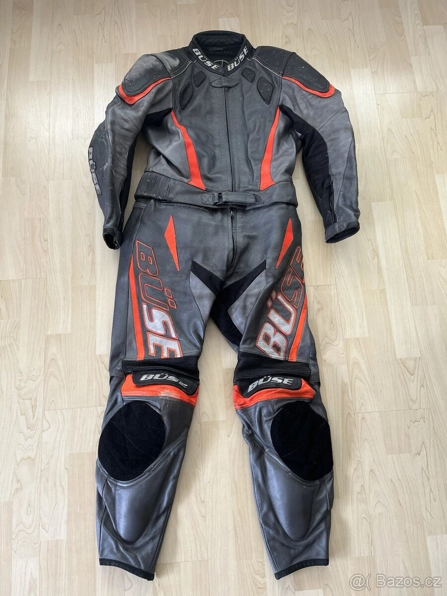 Kožená 2 – dílná dámská kombinéza od značky Büse ve velikosti – 40 vhodná i na postavu o číslo menší Je starší, použitá, ale stačí dát si trochu práce, použít krém na kůži a určitě ještě někde dobře poslouží.