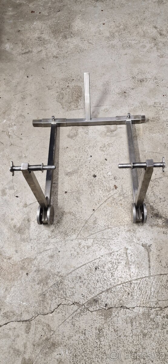Zdravím, prodám stojan na motorku. Je vyroben z nerezového jeklu. Lze použít jak pro přední tak i pro zadní kolo, kde lze zasunout do osy trny o průměru 15mm. Využíval jsem pro zimní spánek pod přední kolo, ale vyměnil jsem motorku a už nemám dutý náboj v kole.