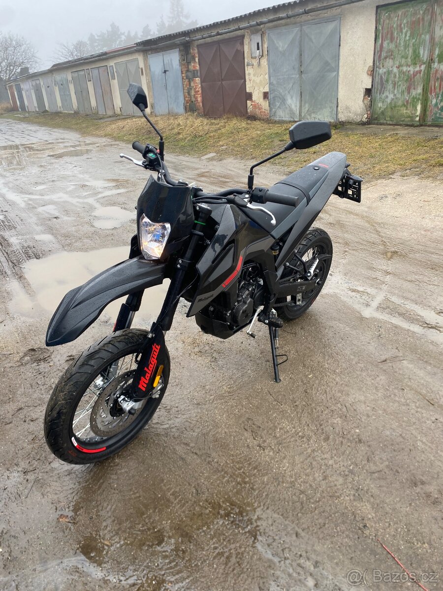 Prodám téměř nový motard Malaguti XSM 125 stejné jako aprilia sx 125, rok výroby 2023, najeto pouze 700 km. Je tam přední světlo a blatník z ktm. Pravý plast na nádrži je lehce poškrábaný.