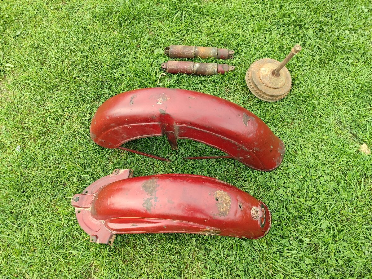 Prodám na Jawa 250/350 půlbuben přední a zadní blatník bez lemu, cena za kus 3000kč a kompletní rozetu se štítem 2500kč, zadní tlumiče 1500kč.
