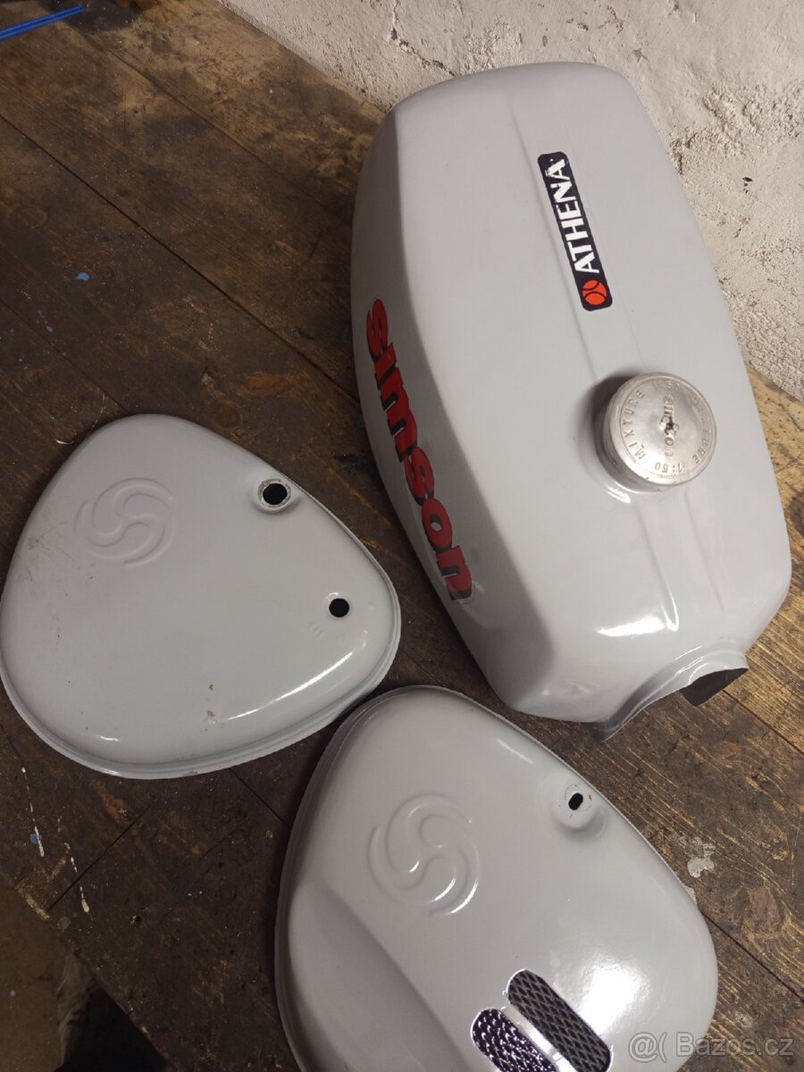 Prodám nádrž na simsona není vyrezlá. Závit na kohoutek v pořádku. Plus přidam boční kryty kastlíku. Pravej kryt upravem pro lepší přívod vzduchu. Cena za komplet. Stav viz foto