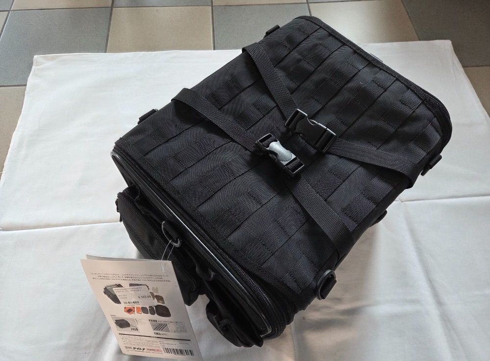 Minimalistický, účelný, nenápadný design, kotvení 4 body pod sedlem motocyklu,2 varianty vnitřního objemu: 44 a 60 l, 5 vnějších kapes na zip, + 1 stahovací např. na láhev, madlo pro pohodlnou manipulaci, popruh pro nošení přes rameno, obsah balení: brašna, potah proti dešti, kotevní popruhy, materiál: polyester, rozměry: 300 × 410-570 × 320 mm