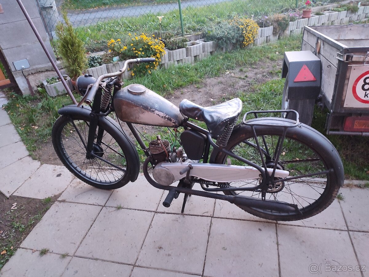 NSU 100 r.v. 1941 - [22.2. 2026]NSU 100 rok 1941, objem 97 cm3. Velmi vzácný model v původním stavu dle foto. Original karburace Graetzin, pěkná nádrž, oba kryty řetězu, má původní štítek. Podobná kategorie jako Jawa Robot nebo ČZ 98, ale v ČR vzácnější.