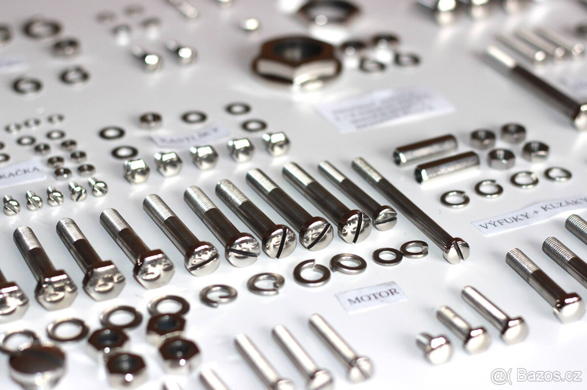 Predám sadu viditeľných skrutiek motora a rámu z leštenej nereze alebo z pozinkovanej ocele na jawu perak.