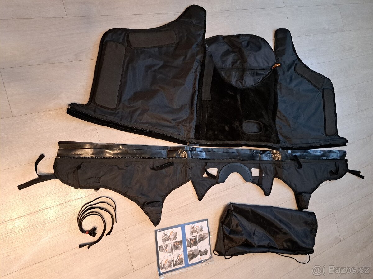 Moto deka na nohy poskytuje optimální ochranu proti dešti a zimě, díky nepromokavému nylonovému materiálu s podlepenými švy a vnitřní termo podšívce s kožíškem. Zaručuje maximální stabilitu i při vyšších rychlostech a komfortní jízdu v chladném či deštivém počasí. Reflexní pásy zvyšují bezpečnost a speciálně upravené postranice umožňují bezpečné položení nohy na zem