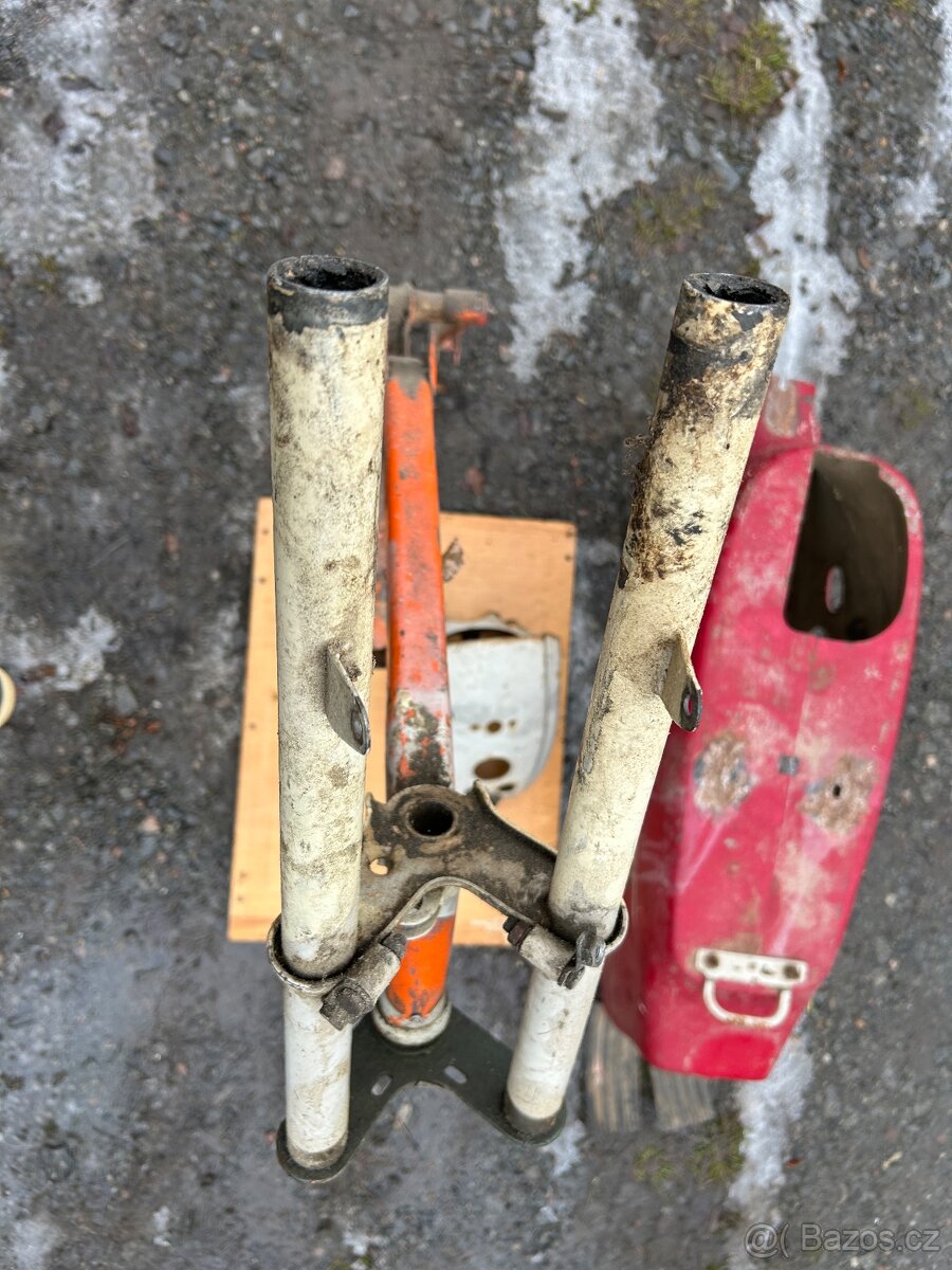 Prodám kapličku, zadní plech a rám na Jawa pionýr, přední vidlice jsou verze bez manžet. Vše k opravě.