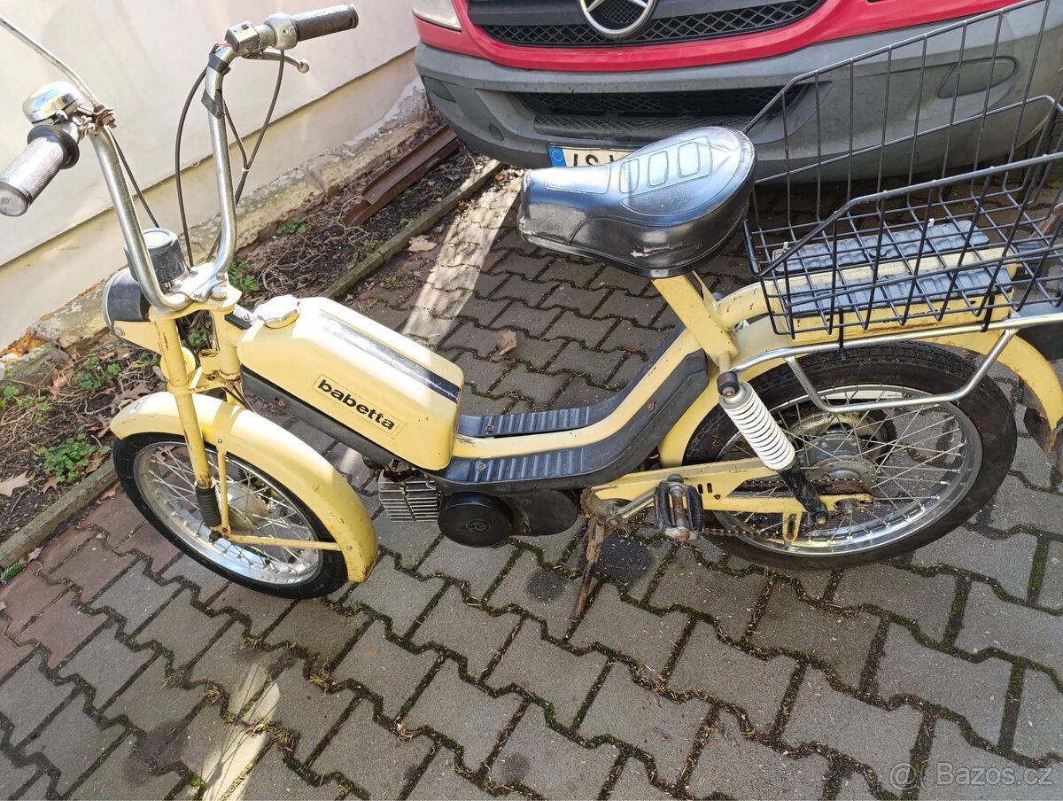 Babetta 210 - [28.2. 2026]Dobrý den, prodám svou Babettu 210. Babetta je dvourychlostní je pojízdná a plně funkční. Svítí ,troubí, brzdí, řadí má funkční tachometr. Babetta má nějaké kosmetické vady ale neni to nic hrozného a nebyl s ni nikdy žádný problém.
