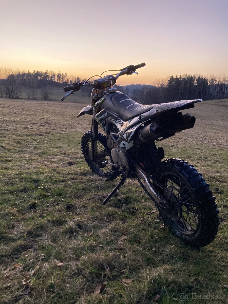 Prodám pitbike 140r s ostrou vačkou. Motorka jede krásně ale dost žere olej, teče olej, hýbe se výplet na předním kole a na přední vidlici jeden plast chybí. Jsou nové řidítka, vzduchový filtr, páčky, řetěz, spojkové lanko a nakopávačka.