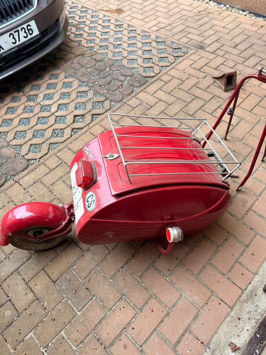 Pav 40 vozik k Jawa,ČZ, Vespa a jine - [13.3. 2026]Prodam privesny vozik Pav 40,r.v.1964,vyrobni cislo 0063,jeden z prvnich, pekny original, celoplechovy, neni rezavy ani prohnily-dle foto.