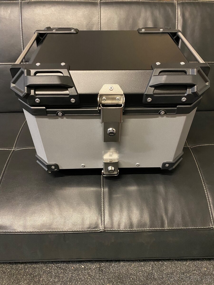 Na prodej nový zadní kufr o objemu 45 l ve stříbrném provedení. Vhodný na cestovní enduro.