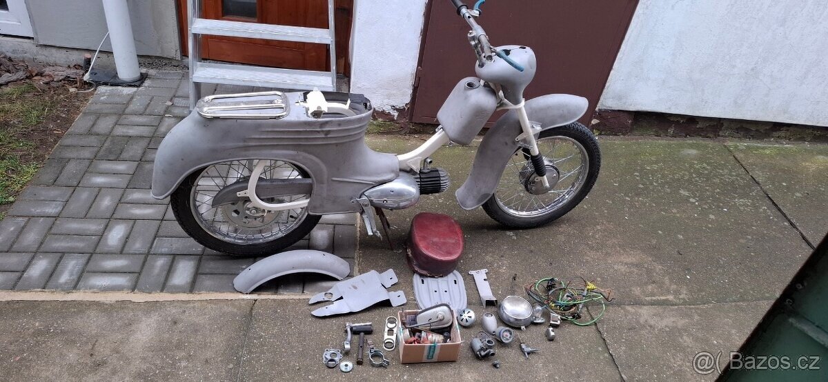Prodám Jawu 555 bez štítku a TP. Před pár lety opískováno. Rám nastříkán komaxit slon. kost. Bohužel na renovaci už nedošlo. Kola nový výplet a nové ráfky. Základ na renovaci.Díly pouze to co je na fotkách.
