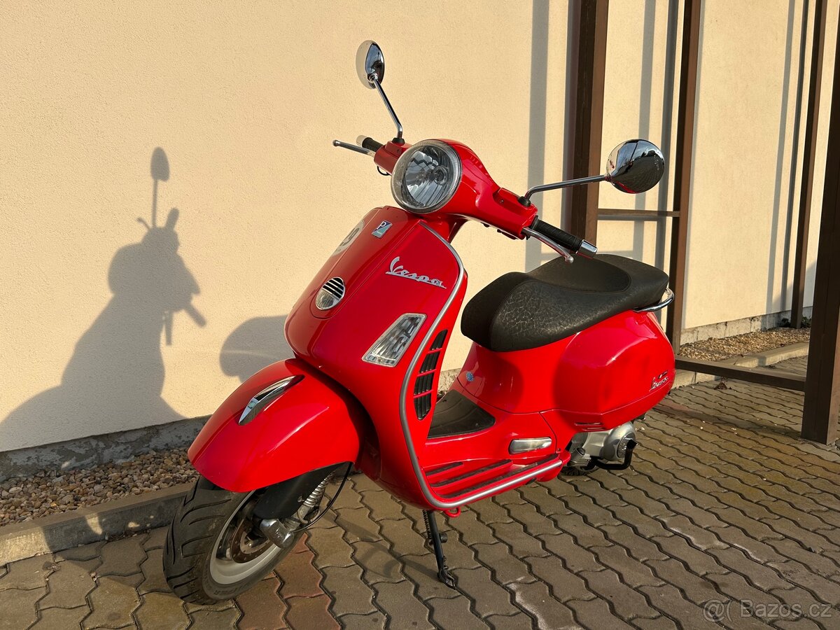 Piaggio Vespa GTS 125, barva červená (rosso), r.v. 2008, stav tacho 30444 km, výkon 11kW, řidičák sk. B, vyhřívané rukojeti, luxusní a pohodlné sedlo s integrovanou pláštěnkou, boční stojan, integrované stupačky pro spolujezdce, po servisu (olej, filtry, svíčka), nové pneu, STK 07/28, ihned k odběru, ve výborném stavu - připravena na sezónu bez dalších investic