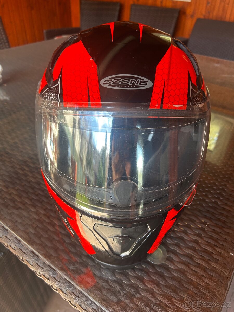 Helma na motorku, zn. Ozone, vel. L (59 - 60 cm) - [26.4. 2026]Otevřená přilba na motorku ve velmi dobrém včetně tašky na přilbu. Sklopný průhledný štítek, výsuvný protisluneční štítek a otevírací větrací otvor- model ECE R22-05. PC: 97 EURO (asi 2.400,- Kč).