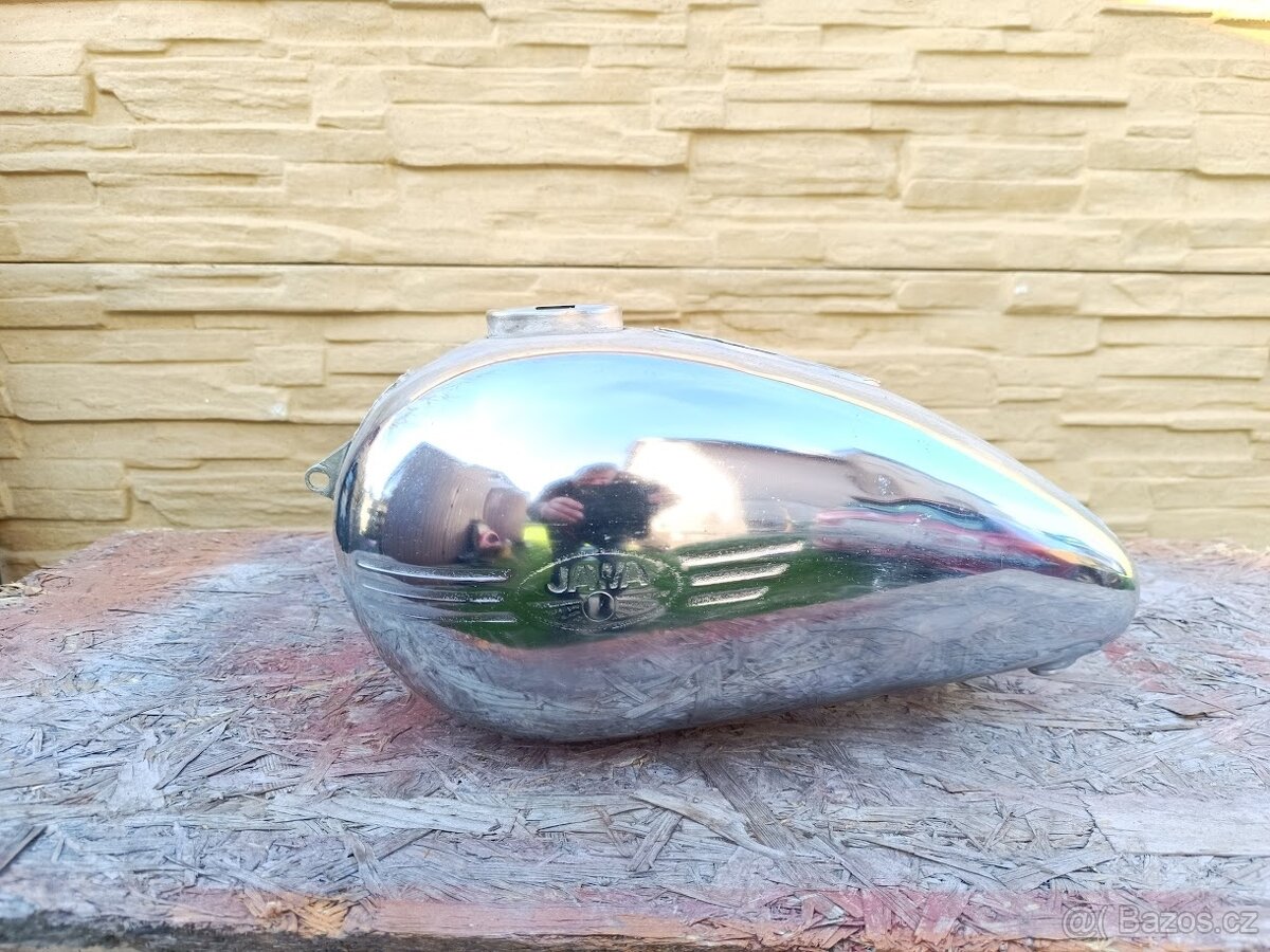 Prodám benzinovou nádrž na Jawa pérák, chromováno před 20ti léty, znaky nic moc, vypadá , že byla i bouchnutá, materiál na totálku...