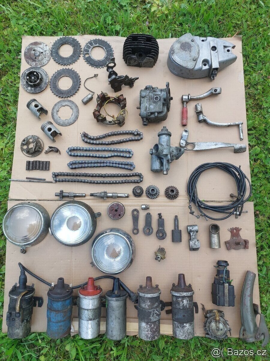 řetězy 4kusy,kladívko zápalování,karburátor(chybí plovák+jehla)typ 2924SBDb2651(1kus),táhlo brzdy,klíč brzdy 1kus,kolínko 1kus,díl řazení 1kus,přepinač světel.Viz foto.Posílám zásilkovnou.